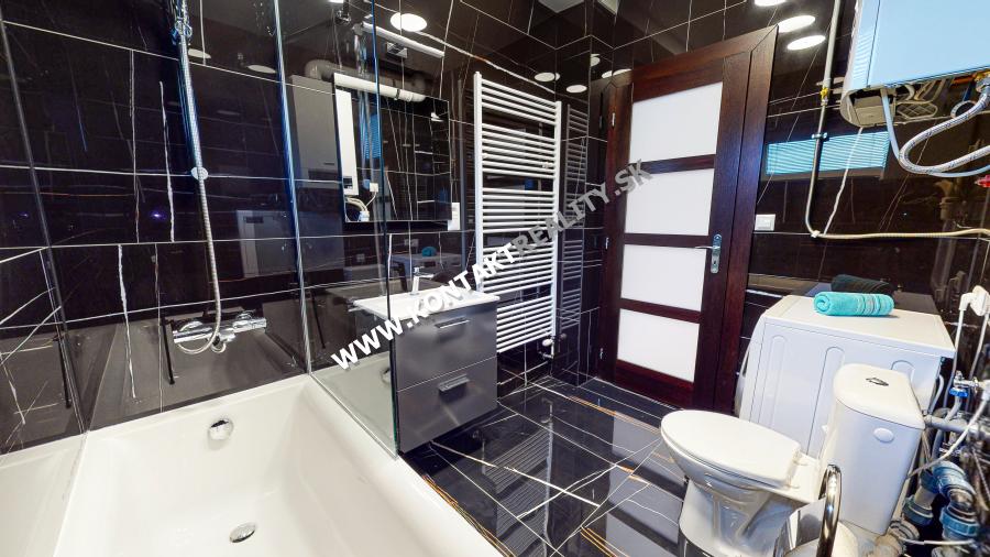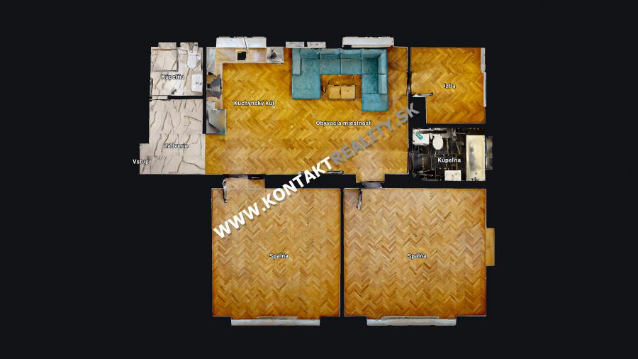 Dispozícia bytu s výmerou 103 m2 nachádzajúceho sa na 3/3 poschodí tvorí: predsieň, 2x kúpeľňa s WC, tri samostatné izby a obývacej izby spojenej s kuchyňou.